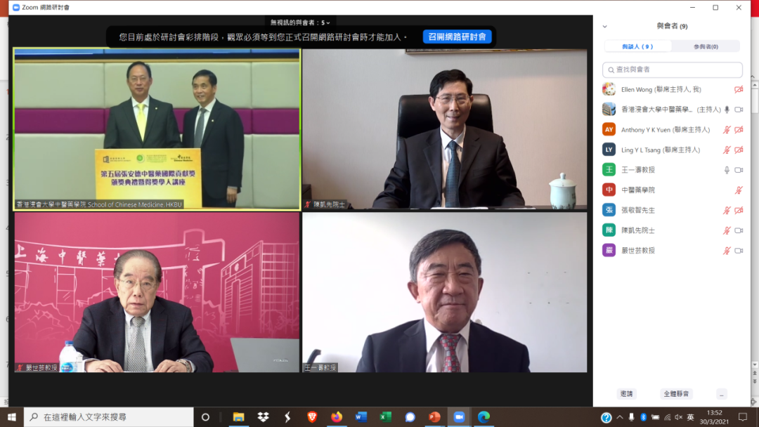 3月30日下午,第五届张安德中医药国际贡献奖颁奖典礼在线上举行。香港浸会大学校长卫炳江教授、评委会主席陈凯先院士、香港浸会大学中医药学院院长吕爱平教授、张安德慈善基金董事张敬智先生,以及逾300名香港注册中医师参加线上典礼。陈凯先院士介绍了获奖人情况,上海中医药大学终身教授严世芸喜获殊荣,以表彰严世芸教授在推动中医药国际化和中医药科学研究方面的贡献和成果。此前,上海市中医药学会会长胡鸿毅教授对该奖项进行提名推荐。