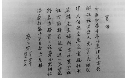 蔡先生年轻时曾作《悬壶之喜》诗一首:“十年窗下苦功成,今日悬壶试一鸣,行见杏林春色满,万家生佛共心倾。”表达了他对成为一名济世利人医者的欢喜期待之情,亦是他一生为医为人的光耀成就与淡泊超然的人生境界真实写照。今特以此诗为题以示纪念,岐黄事业的后辈自当努力,不忘初心,砥砺前行。蔡氏妇科流派今已枝繁叶茂,声名远播,传人遍布,造福众坤,足以告慰先生矣!