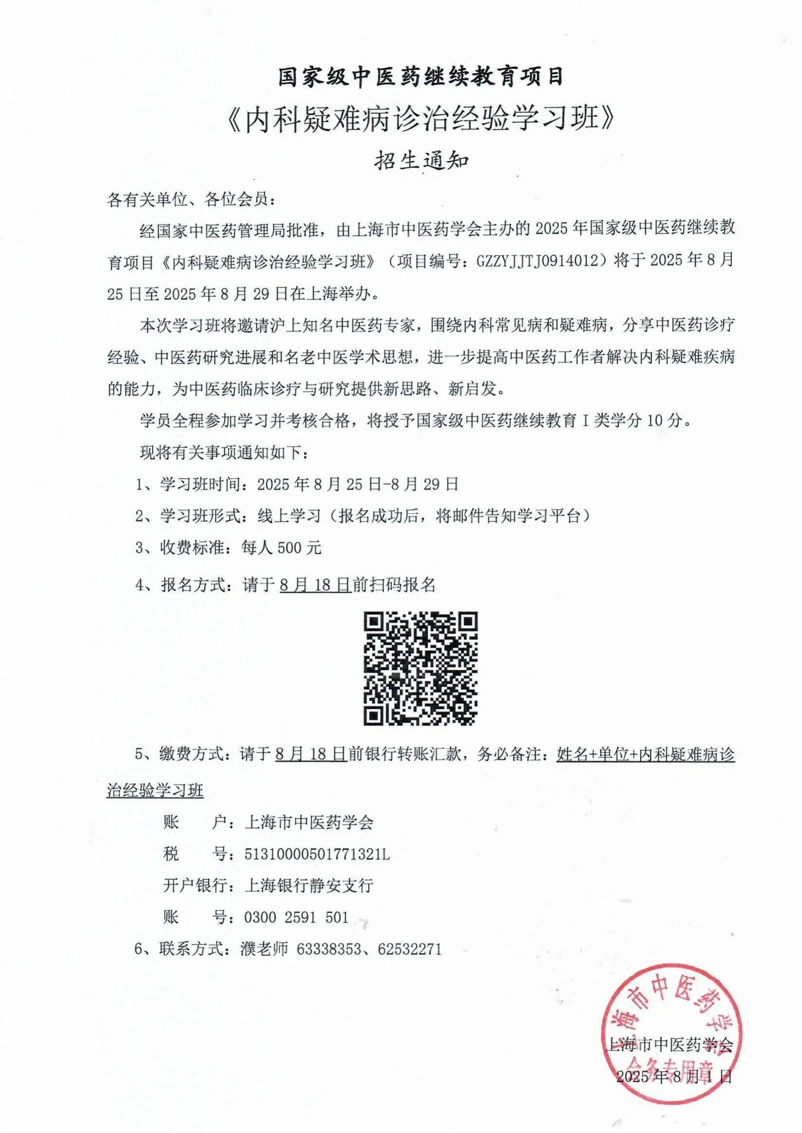 经国家中医药管理局批准,由上海市中医药学会主办的2025年国家级中医药继续教育项目《内科疑难病诊治经验学习班》(项目编号:GZZYJJTJ0914012)将于2025年8月25日至2025年8月29日在上海举办。