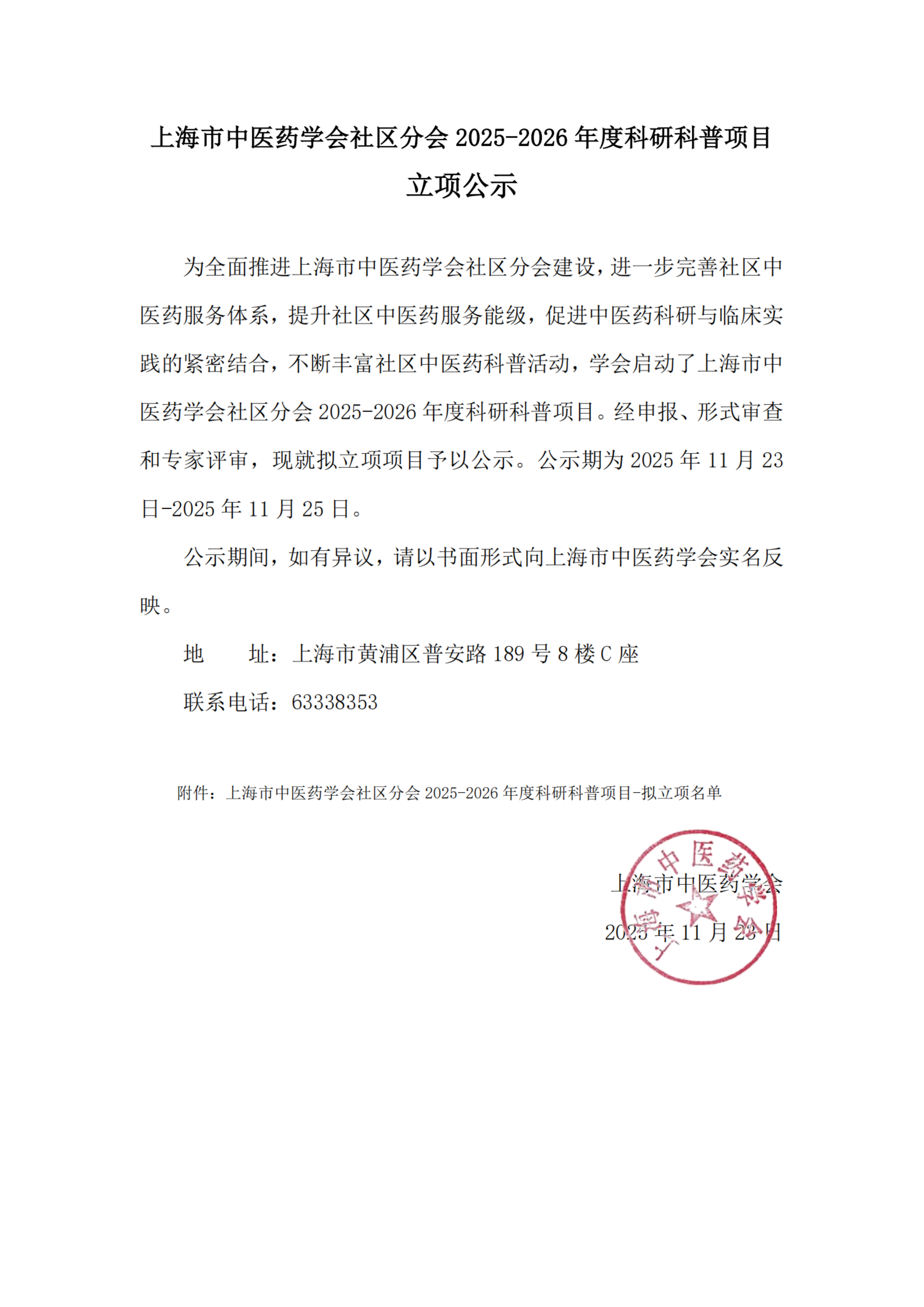 上海市中医药学会社区分会2025-2026年度科研科普项目立项公示
