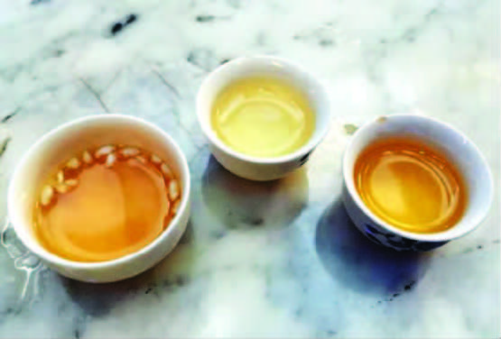 第一道茶,“苦茶”。客人落 座后, 主人一边陪客人聊天,一 边吩咐家人将沱茶放到陶罐里 烤,烤至茶叶黄而不焦、有香气 溢出时为止,然后向其中倒入90 摄氏度左右的开水,泡制一会儿 即成。白族人有一个习俗,“酒满 敬人,茶满欺人”。因此,茶不能冲 得过满,尤其是第一道茶,冲小半 杯就可以了,意在小品小饮,礼到 为止,不以喝茶为目的。“苦茶”浓 酽,色若琥珀,闻起来有一股淡淡 的焦味, 啜上一口, 感觉有些苦 涩,细细品尝,又觉得有些清香。 白族人认为,茶如人生,苦茶代表 了人生的苦境, 一个人要想有所 作为, 首先就得学会吃苦, 可谓 “宝剑锋从磨励出,梅花香自苦寒 来”,自古雄才多磨难,从来纨绔 少伟男。只有吃尽了苦中之苦,方 能品出人生的滋味。