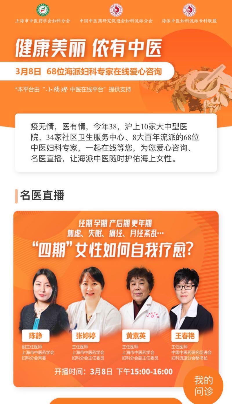 2020年春季,在全国医务人员齐心协力共同抗疫的时刻,上海市中医药学会妇科分会联合中国中医药研究促进会妇科流派分会、海派中医妇科流派专科联盟,号召并组织了来自本市10家二三级中医医院、34家社区服务中心、68位海派妇科知名专家及基层中青年医师,在3月8日举办“健康美丽,侬有中医“为主题的中医妇科线上义诊活动,此次活动得到上海市创新医疗服务品牌——小橘灯海派中医线上医疗服务平台的大力支持,为全市广大女性同胞免费在线咨询、直播答疑。