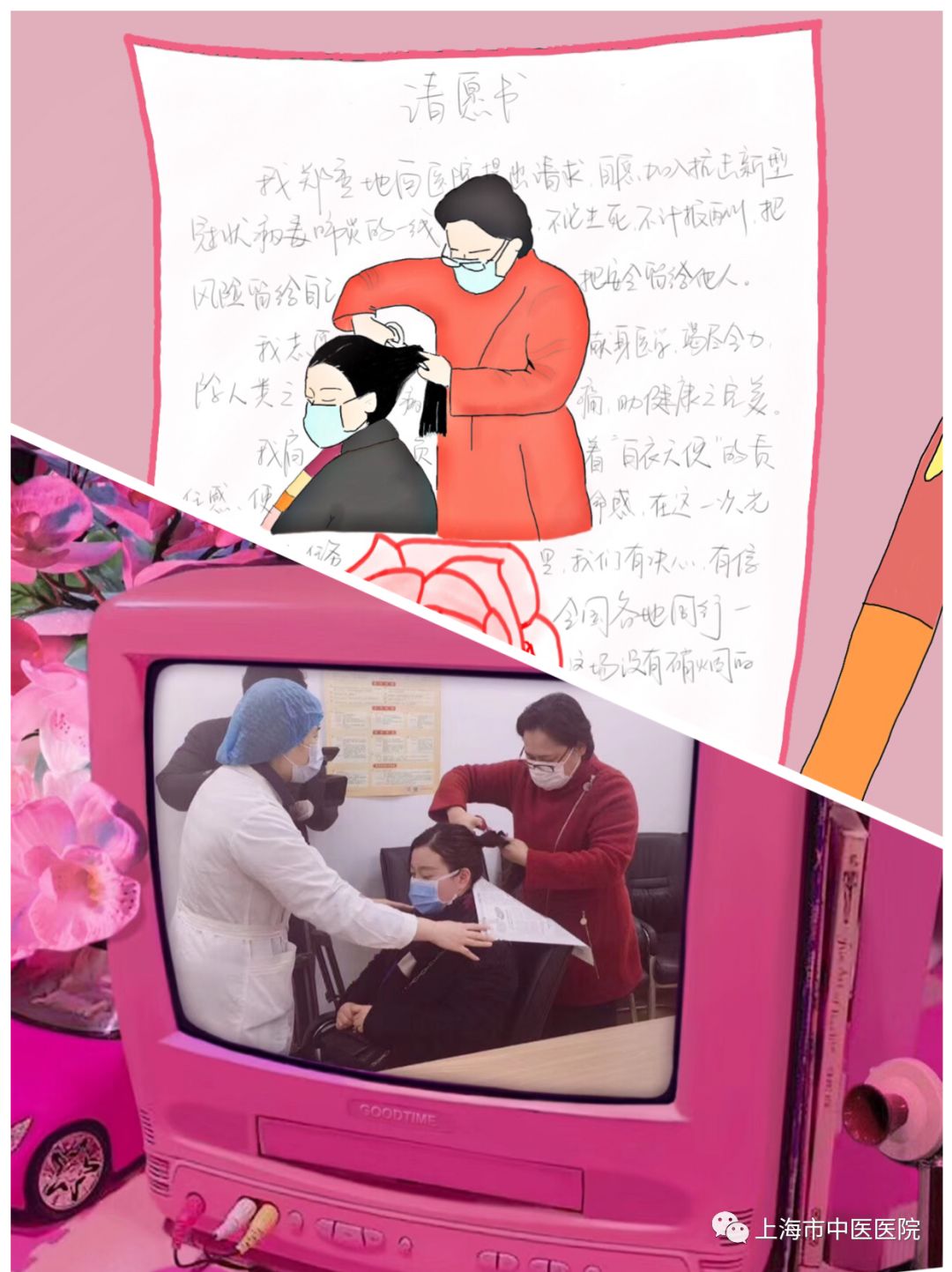 图为上海市中医医院护理部主任张洁亲自为出征的护士修剪长发。
