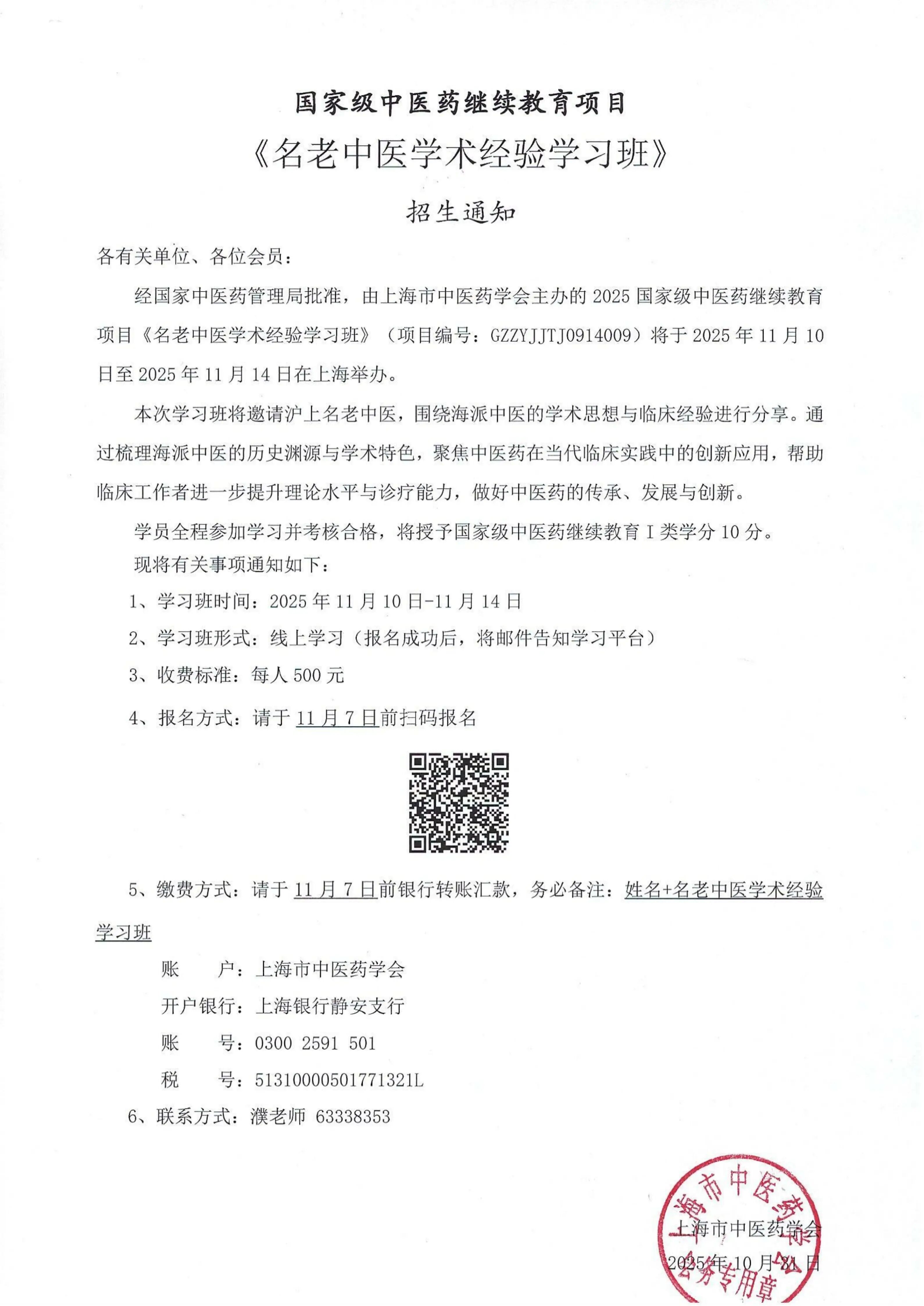经国家中医药管理局批准,由上海市中医药学会主办的2025国家级中医药继续教育项目《名老中医学术经验学习班》(项目编号:GZZYJJTJ0914009)将于2025年11月10日至2025年11月14日在上海举办。
