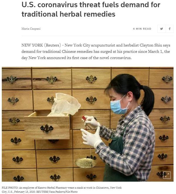 纽约市针灸师、草药医师克莱顿·邵长期从这家药房进货。他告诉路透社记者,自确诊首例新冠病毒感染者以来,纽约市对传统中医药的需求大增。