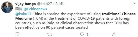 印度网友vijay banga说:中国正在与意大利等国分享中医药治疗新冠肺炎患者的经验。中国临床经验表明,中医药对90%的新冠病例有效。