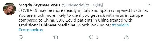 美国网友Magda Szyrmer VMD说:与中国相比,意大利、西班牙等国的新冠肺炎患者死亡率可能更高。中国90%以上的新冠肺炎患者都接受了中医药治疗。是不是值得了解一下呢?