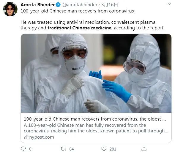 印度网友Amrita Bhinder说,中国百岁老人在感染新冠病毒后康复了。根据报道,他使用了抗病毒药物,康复期血浆和传统中医药。