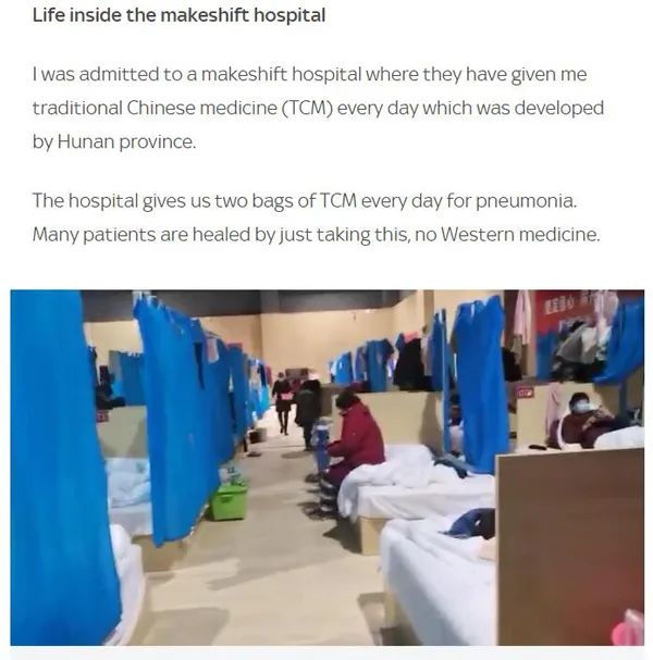英国天空新闻网站对接受中医药治疗的新冠肺炎患者进行了采访。29岁的武汉女子李小熊(Li Xiaoxiong,音译)说,她在方舱医院接受治疗时,每天都服用两袋中药,很多病人靠着吃中药痊愈了。