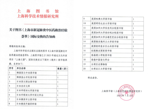 《上海市新冠肺炎中医药救治经验荟萃》被国际主要图书馆交换收藏