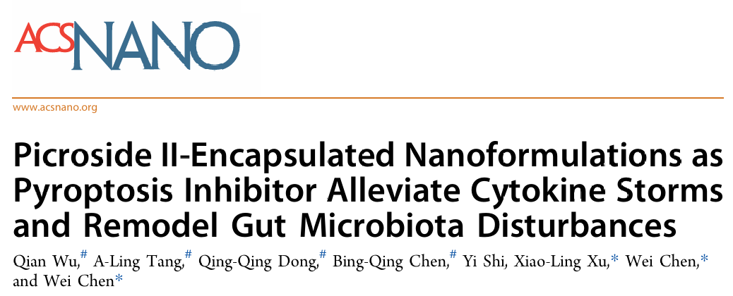 2025年9月1日,上海市中医药学会危重病分会陈伟教授团队在国际权威期刊《ACS Nano》(IF=16)发表了名为“Picroside II-Encapsulated Nanoformulations as Pyroptosis Inhibitor Alleviate Cytokine Storms and Remodel Gut Microbiota Disturbances”的研究成果。