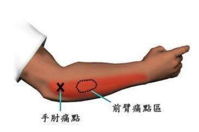 “网球肘”的临床症状表现为肘部疼痛,按压痛处有结节或肿胀,做“提壶倒水”的动作时疼痛加重,甚至无法完成这一动作。